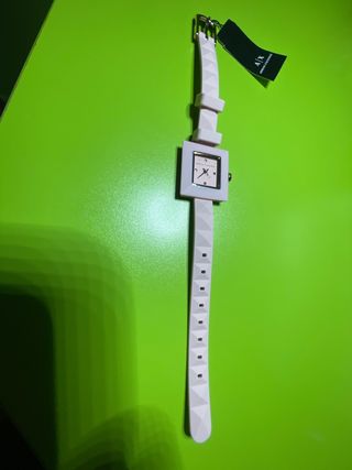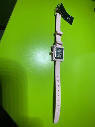Elegante reloj Armani Exchange con un diseño cuadrado y moderno. La correa es de un suave color rosa y la caja presenta detalles en dorado. - Correa de silicona con textura. - Esfera cuadrada. - Cierre de hebilla.