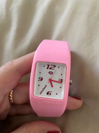 Reloj pulsera de agujas, de color rosa fucsia. Completamente nuevo, sin estrenar. Va en cajita de regalo. Con correa de cuero sintética. No tiene talla, puesto que como es de doble pulsera, se ajusta a la medida de muñeca que tengas. A quién lo quiera comprar, me hago cargo de ponerle una pila nueva y enviarlo en funcionamiento.