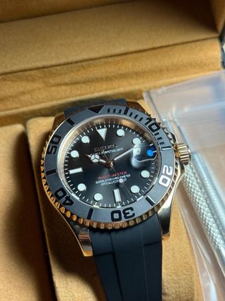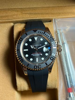 Seiko Yacht Master Oro Rosa Negro -Movimiento Seiko NH35 automático con hasta 48 horas de reserva -Cristal de Zafiro, resistente a arañazos -Correa caucho de primera calidad -Dial numérico para fecha Nunca usado Incluye enlace para ajustar la correa Envío rápido y cuidado El reloj se envía con la caja, bien protegido y empaquetado. Envío en máximo 24/48 horas después de comprarlo. + Más modelos y unidades disponibles en mi perfil