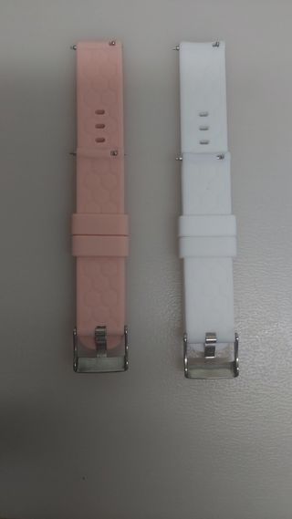 Dos correas de repuesto para reloj, una en color rosa y otra en blanco. Ambas tienen un diseño texturizado y son ajustables. - Material de silicona. - Cierre de hebilla metálica. - Diseño con patrón de panal en la correa rosa. - Agujeros para ventilación y ajuste. Medida. 18 mm