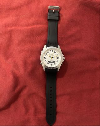 Reloj analógico de la marca española, Marea, con movimiento japones Miyota. Caja de acero inoxidable. Correa de silicona flexible de alta resistencia. Bisel giratorio unidireccional, en color rojo. Cristal de mineral endurecido. Reloj Nuevo a estrenar, con etiqueta.