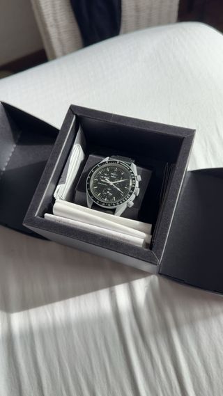 Reloj Omega x Swatch Mission To The Moon. - Esfera negra con detalles plateados. - Correa de velcro negra. - Muy pequeño desperfecto (se ve en la foto) - Envío o venta en persona Madrid.
