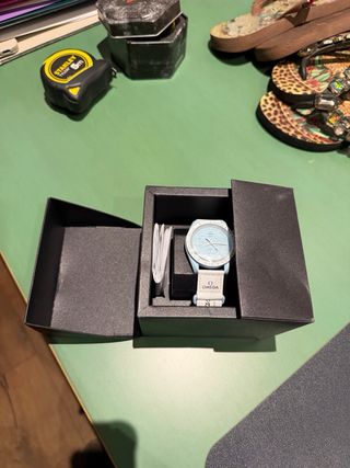Reloj Omega x Swatch Misión a Neptuno. - Esfera y correa en tono azul. - Diseño inspirado en el planeta Neptuno. - el reloj está sin uso, PERO LA CAJA ESTÁ DAÑADA. se rompió en el trasporte. ver las fotos. de ahí su precio