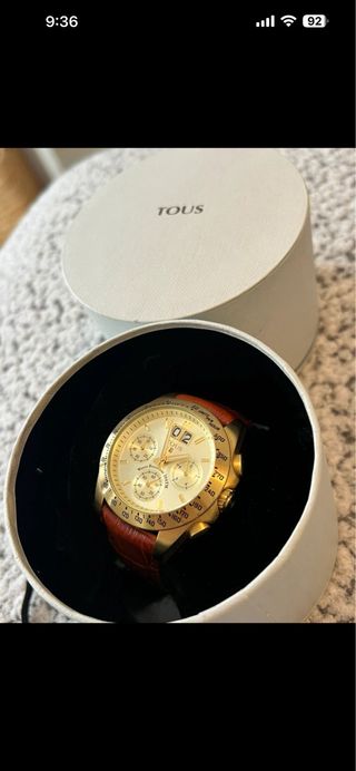 Precioso reloj Tous unisex, con correa de piel marrón y caja dorada. Elegante y en perfecto estado. La corona es grande, de unos 40 mms, aprox. La correa es nueva, la original era pegada, esta es cosida. - Correa de piel. - Caja de acero dorado. - Esfera blanca.