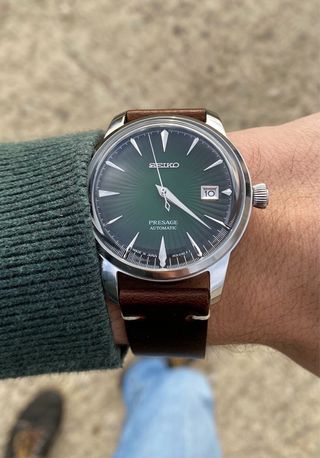 Reloj automático con un diseño clásico y elegante. - Caja de bronce. - Correa de cuero marrón. - Esfera verde.