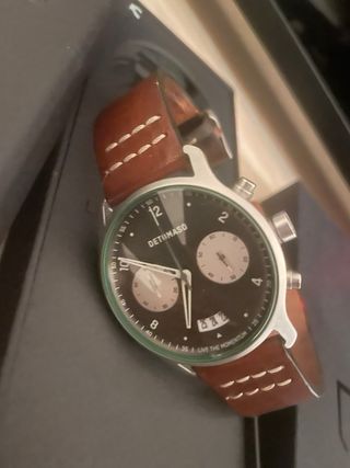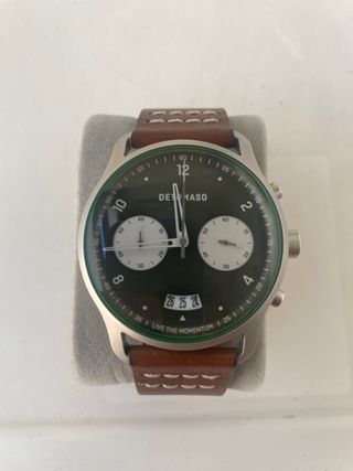 Espectacular reloj Detomaso, es de un diseño increible y con una calidad de materiales y acabados fantástica, es un reloj casual y muy versátil muy bonito y perfecto para cualquier ocasión, el reloj esta como nuevo literalmente 10/10, se ha usado en alguna ocasion puntual y está como nuevo. La esfera es de un color verde muy bonita con las subesferas claras y con la correa en piel marron con pespuntes en blanco muy elegante, un reloj perfecto para cualquier ocasión, se entrega con su caja. Mas productos en mi perfil.