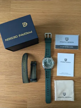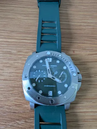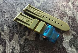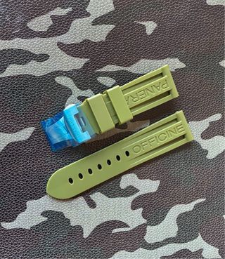Correa de repuesto para reloj Panerai en color verde. Correa de repuesto para reloj Panerai. Ancho de banda : 24mm Valida para modelos : - Luminor; Luminor Marina, GMT y cualquier modelo con ancho entre asas de 24mm - Material de caucho negro, hidrogenado. Calidad optima (no endurece o parte con el uso y el tiempo) - Hebilla de acero inoxidable plateada con cierre deployante. - Envío o entrego con 2 tubos de refuerzo para el anclaje de los pasadores al reloj. Fotos reales hechas por mí