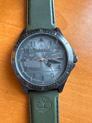 Reloj de la marca Timberland con un diseño moderno y resistente. - Correa de cuero verde. - Caja de metal en color negro. - Esfera con detalles de brújula y paisaje.