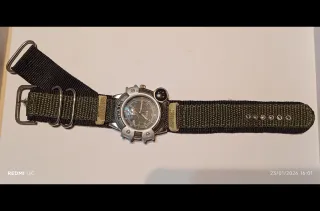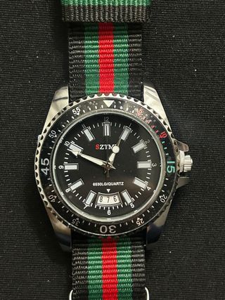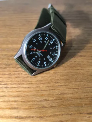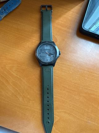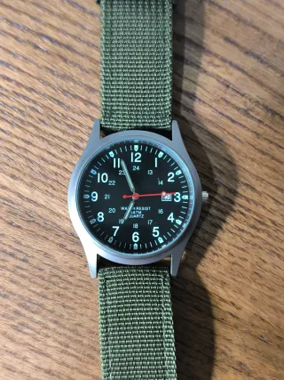 Reloj de estilo militar con correa verde. Fue un regalo, nunca lo he llegado a usar, está nuevo lo único que no creo que sea resistente al agua. - Esfera negra con números claros. - Correa de tela o nylon en tonos verde y negro. - Diseño inspirado en relojes de campo.