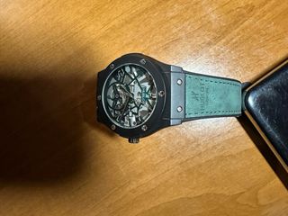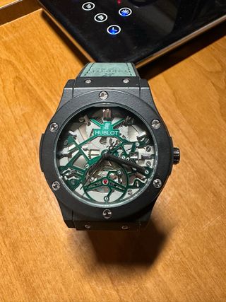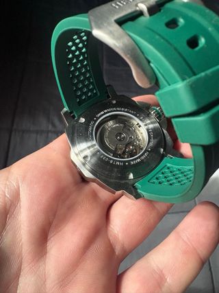 Elegante reloj con un diseño esqueleto que muestra su mecanismo interno. - Caja y correa en tonos negro y verde. - Esfera abierta que permite ver el movimiento.