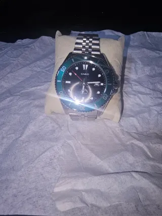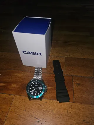 Reloj Casio modelo Marlin con bisel en color verde. - Esfera negra. - Correa de metal. - Bisel giratorio. Reloj nuevo, correa original y correa de acero, valorada en 30 €