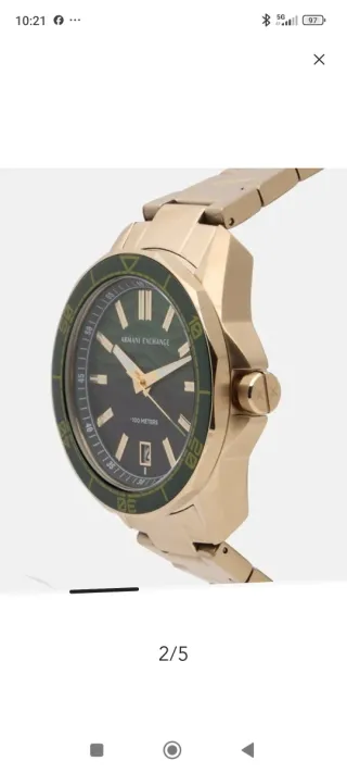 Reloj de pulsera con un diseño elegante y moderno. - Esfera de color verde con detalles en dorado. - Correa de eslabones en tono dorado.