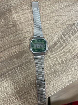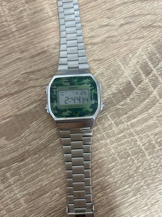 Reloj Casio con diseño de camuflaje en la esfera. - Correa de metal plateado. - Pantalla digital.