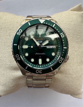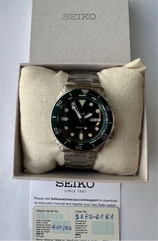 Nuevo a Estrenar, con etiquetas, ni un desperfecto. Reloj Seiko 5 Sports SRPD61K1 con esfera verde y detalles plateados. Incluye caja original y tarjeta de garantía. - Movimiento automático. - Correa de acero inoxidable.