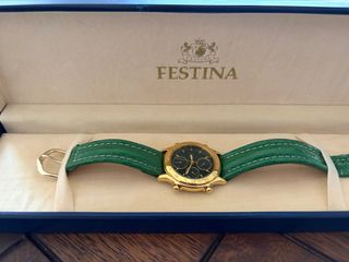 Elegante reloj Festina para mujer con un diseño llamativo. - Caja y detalles en tono dorado. - Correa de piel en vibrante color verde.