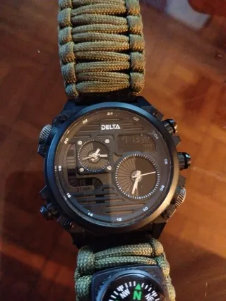 Reloj de pulsera con un diseño robusto y moderno. - Correa de paracord en color verde militar. - Esfera con múltiples indicadores y detalles en negro.
