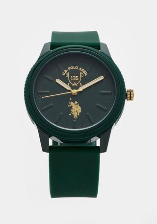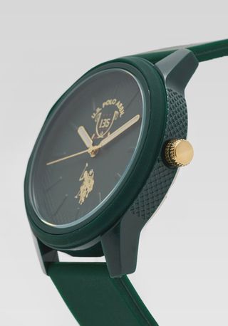 Reloj de la marca U.S. Polo Assn. con un diseño moderno y elegante. - Esfera en tono verde oscuro. - Detalles y manecillas en dorado. - Correa de silicona verde. - Cierre de hebilla.