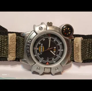 Reloj de pulsera TUAREG con un diseño deportivo y funcional. Incorpora una pequeña brújula en la esfera. - Correa de tela verde. - Bisel plateado. - Esfera negra con detalles en blanco y naranja.