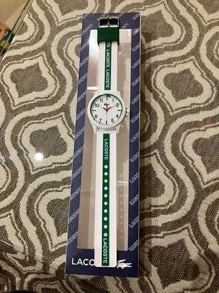 Reloj de la marca Lacoste con un diseño moderno y deportivo. Presenta una combinación de colores blanco y verde que lo hace destacar. - Correa de silicona con detalles. - Esfera blanca con logo. Nunca usado, mecanismo aún sin activar, original en su caja y con QR de autenticidad. Buen precio. El envío se haría con cuidado y protección para el producto.