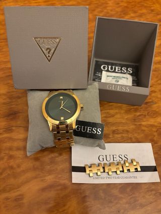 Elegante reloj de la marca Guess con un diseño moderno y sofisticado. - Esfera de color verde. - Correa y caja de acabado dorado. - Incluye caja original y garantía limitada de dos años.