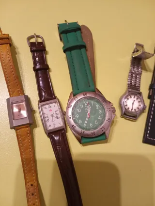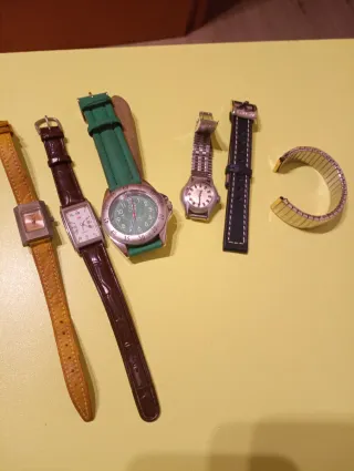 Conjunto de cuatro relojes y dos pulseras para relojes. - Un reloj con correa amarilla. - Un reloj con correa marrón. - Un reloj con correa verde. - Un reloj con correa metálica. - Una pulsera elástica metálica. - Una pulsera de cuero negra con pespuntes.