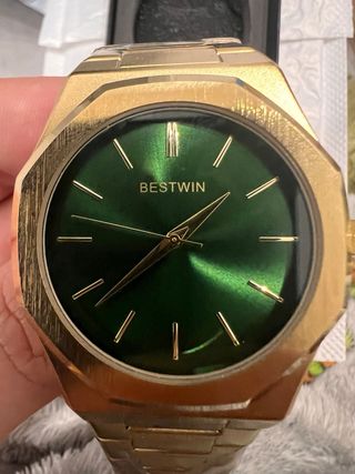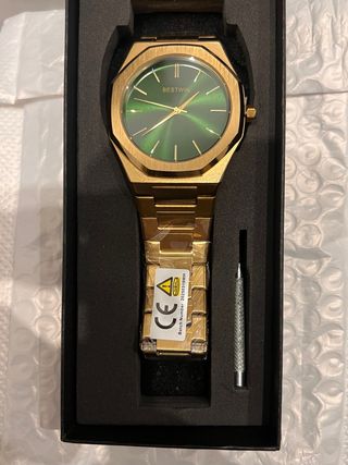Elegante reloj BESTWIN con un diseño moderno y llamativo. - Esfera de color verde. - Caja y correa de metal en tono dorado. - Incluye herramienta para ajustar la correa.