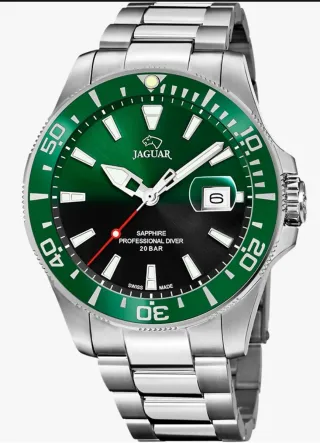 Elegante reloj de buceo Jaguar con un llamativo diseño en verde esmeralda y detalles plateados. Perfecto para quienes buscan estilo y funcionalidad. - Bisel giratorio unidireccional. - Ventana de fecha. - Correa de acero inoxidable. - Resistencia al agua de 200 metros.