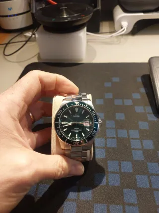 Elegante reloj con esfera verde y detalles plateados. - Bisel giratorio azul. - Correa de eslabones metálicos. - Diseño deportivo y moderno.
