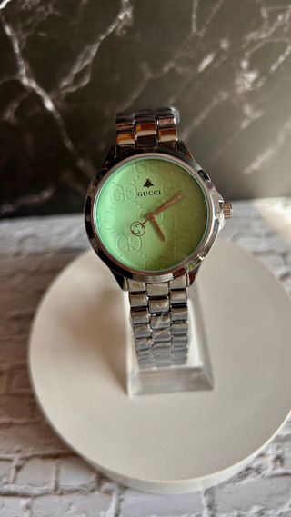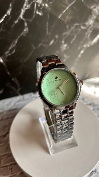 Elegante reloj de mujer con un diseño moderno y llamativo. - Esfera de color verde vibrante. - Correa de eslabones plateada. - Detalle del logo de Gucci en la esfera.