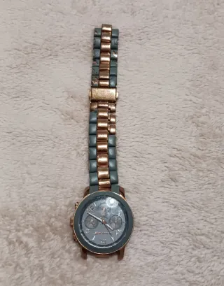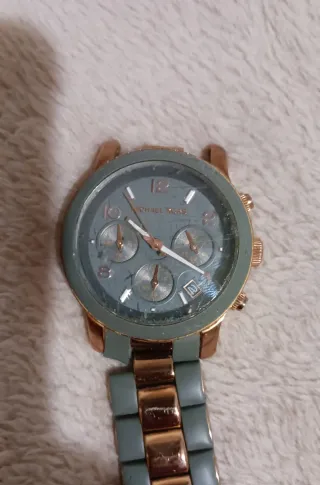 Reloj Michael Kors para mujer, modelo MK5465, con un diseño elegante en tonos dorados y verde azulado. Totalmente funcional, pero la correa está rota. Se me enganchó y se rompió. Ideal si se quiere poner otra correa o se quiere para piezas. Sin pila