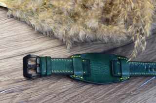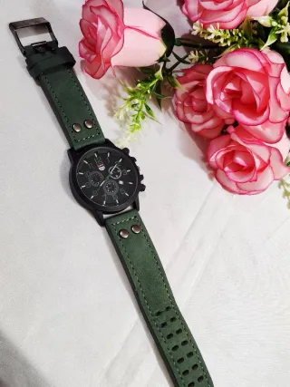 Elegante reloj con correa de cuero verde y detalles plateados. - Esfera de color verde. - Correa de cuero con textura. - Cierre de hebilla plateada.