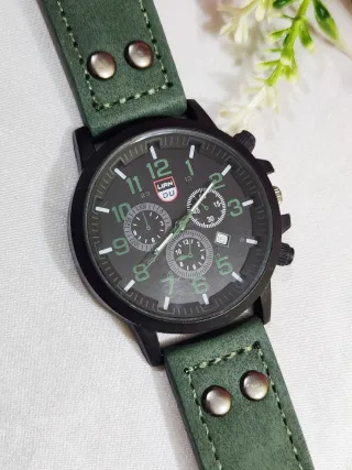 Elegante reloj de la marca Pier One, con un diseño moderno y sofisticado. - Correa de cuero verde oliva. - Caja de acero inoxidable plateada. - Esfera con detalles plateados y agujas visibles.