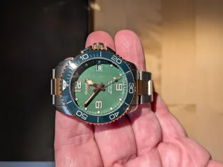 Reloj automático con esfera verde y detalles dorados. - Bisel giratorio. - Correa de eslabones en acero y dorado. -Sin caja.