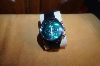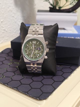 Elegante reloj de pulsera para hombre con un diseño moderno y llamativo. - Esfera de color verde. - Correa y caja de acero inoxidable en tono plateado. - Bisel giratorio verde. En su dia costo 120 euros y esta practicamente nuevo