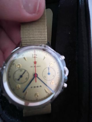 Este reloj Red Star presenta una combinación de colores dorados y verde militar, con una correa de lona. - Correa de lona de color verde militar. - Correa de cuero adicional de color marrón. - Incluye estuche de transporte. - Incluye herramienta para cambio de correa.