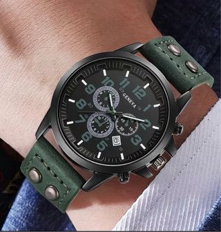 Conjunto de relojes de pulsera con diferentes diseños y correas. - Reloj con correa de cuero marrón y esfera negra. - Reloj con correa metálica negra y esfera dorada. - Reloj con correa de cuero verde y esfera negra. - Reloj con correa metálica plateada y esfera blanca. - Reloj con correa metálica negra y esfera negra. -Puedes escojer y precio va por igual