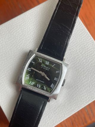 Reloj de cuerda Festina con esfera verde y detalles en números romanos. Un clásico con un diseño atemporal. El reloj funciona bien, pero necesitaría una puesta a punto ya que lleva guardado 60 años. Podria variar de uno a tres minutos al día. - Mecanismo de 17 rubíes. - Correa de piel negra. - Fabricado en Suiza.