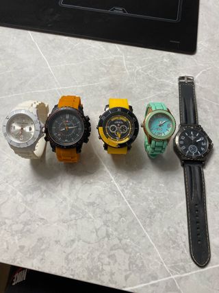 Conjunto de cinco relojes con diferentes diseños y correas. - Reloj con correa blanca. - Reloj con correa naranja. - Reloj con correa amarilla. - Reloj con correa verde azulado. - Reloj con correa negra.