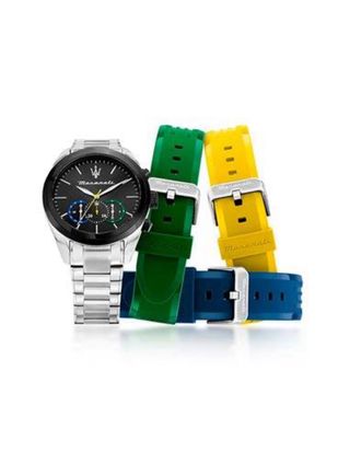 Reloj Maserati con correa de metal plateada y tres correas adicionales intercambiables. - Correa de metal plateada. - Correa de silicona verde. - Correa de silicona amarilla. - Correa de silicona azul.