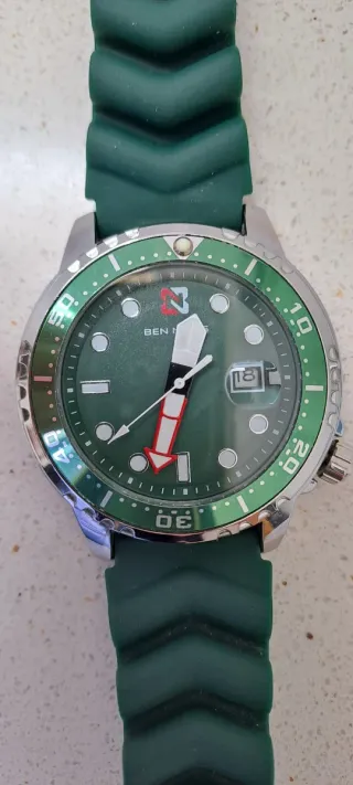 Reloj deportivo BEN NEVIS con un diseño moderno y llamativo. - Bisel giratorio en color verde con detalles plateados. - Esfera verde con marcadores plateados. - Ventana de fecha. - Cierre de hebilla. - Indicador de fecha. Resistente al agua con calendario mensual automático de gran visibilidad. Correa de silicona haciendo juego con el reloj. Cristal resistente a los arañazos. Movimiento de cuarzo. Manecillas muy visibles en la oscuridad
