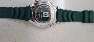 Elegante reloj para hombre con un diseño moderno y llamativo. - Bisel giratorio en color verde. - Correa de acero inoxidable plateada. - Esfera verde con detalles plateados. - Diver (300 metros) resistencia