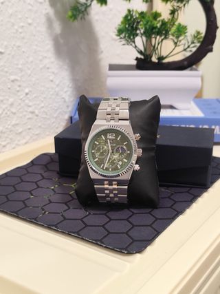 Elegante reloj con esfera de color verde y detalles plateados. - Diseño moderno y sofisticado. - Correa de eslabones metálicos. - Indicador de día y fecha.