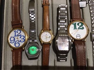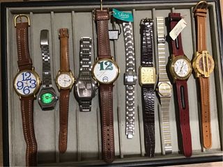 Conjunto de nueve relojes de diferentes marcas y estilos. - Reloj con esfera blanca y números azules. - Reloj con esfera verde luminiscente. - Reloj con esfera blanca y detalles dorados. - Reloj con esfera plateada y detalles negros. - Reloj con esfera dorada cuadrada. - Reloj con correa de piel marrón y esfera dorada. - Reloj con correa de piel roja y esfera blanca. - Reloj con esfera dorada y detalles en rojo. - Reloj con esfera dorada y detalles en marrón. Sin garantia de funcionamiento Cierre negocio
