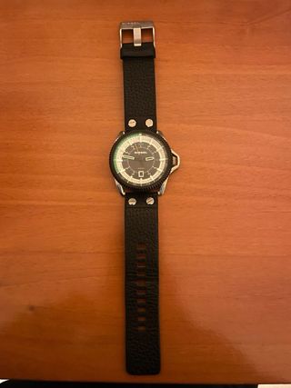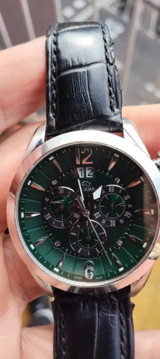 Elegante reloj Jaguar con diseño deportivo y esfera verde. - Modelo J661/3. - Tres subesferas para funciones de cronógrafo. - Correa de piel negra con textura. - Bisel plateado. - Indicador de fecha. La correa está bastante desgastada la original vale 50 euros . No escucho ofertas absurdas pensar que nuevo vale 300 euros . Con caja en perfecto estado.