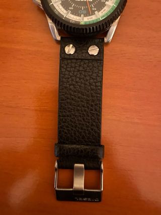 Reloj de pulsera WTI con correa verde y detalles plateados. - Bisel con escala taquimétrica. - Indicador de hora mundial. - Movimiento Japan Movt. - Hay que ponerle pila.