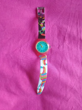 Diversos relojes Swatch con diseños vibrantes y llamativos. Unisex Perfecto estado Pregunta por el precio o hazme tu oferta - Correa naranja con palmeras y texto World Tour. - Correa multicolor con diseño de cómic y símbolos. - Correa amarilla con esfera de manchas. - Correa verde con esfera verde.