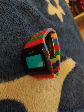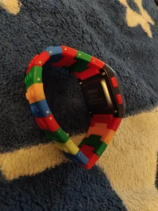 Reloj digital con un diseño divertido y colorido, inspirado en bloques de construcción. - Correa ajustable con segmentos de colores rojo, verde y azul. - Esfera digital con marco negro.