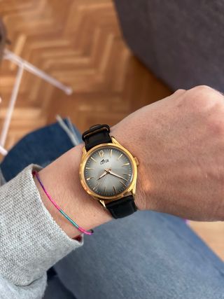 Elegante reloj de pulsera con detalles dorados y una correa de cuero verde.años 90 - Esfera redonda. - Correa de cuero. - Cierre de hebilla.