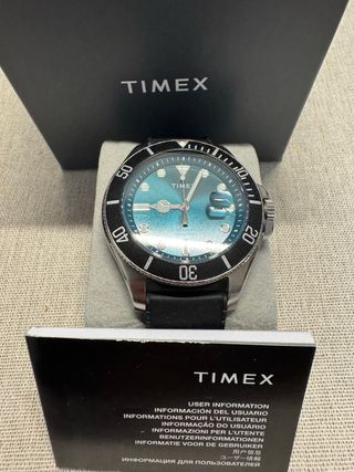 Reloj Timex de la colección Harborside Coast con una esfera degradada en tonos verdes y turquesas. Presenta un diseño inspirado en los relojes de buceo. - Bisel giratorio unidireccional. - Correa de cuero negra. - Indicadores luminosos en las manecillas y marcadores. 🔸IMPOLUTO-COMO NUEVO Timex.relojes.reloj.seiko.coleccion.casio.citizen.