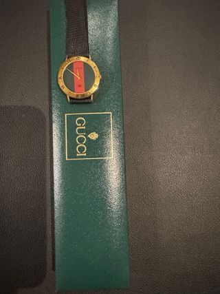 Elegante reloj vintage de la marca Gucci. Un accesorio clásico con un diseño distintivo. - Esfera con detalles en rojo y verde. - Correa de piel negra. - Bisel dorado. - Numeración romana. -Funciona perfectamente. -con caja original -correa y hebilla original. -nombre y apellido gravado al dorso.